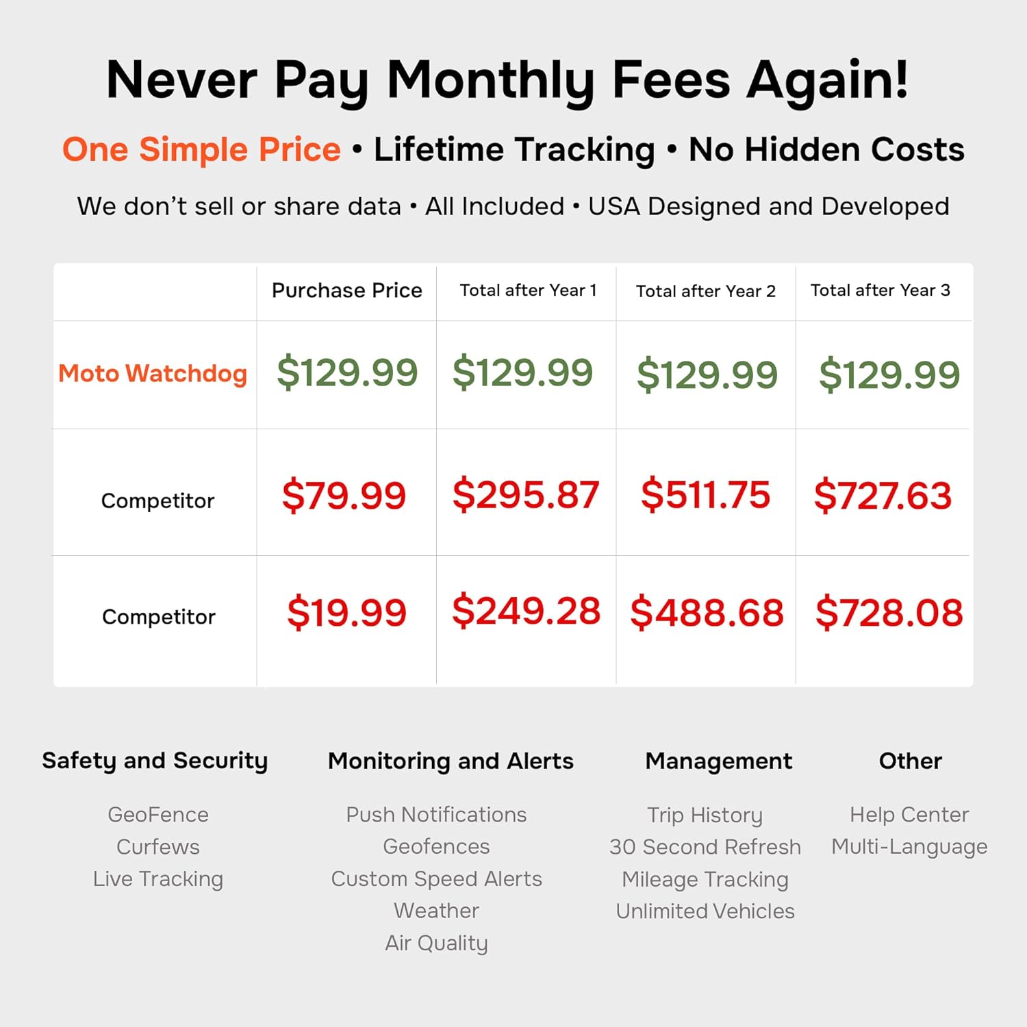 Designed and developed in the USA, the Wired GPS Tracker ensures high-quality performance and reliability. With quick and easy installation, you can start tracking your vehicles in no time. Stay informed and in control with the Moto Watchdog feature that provides real-time updates and notifications.